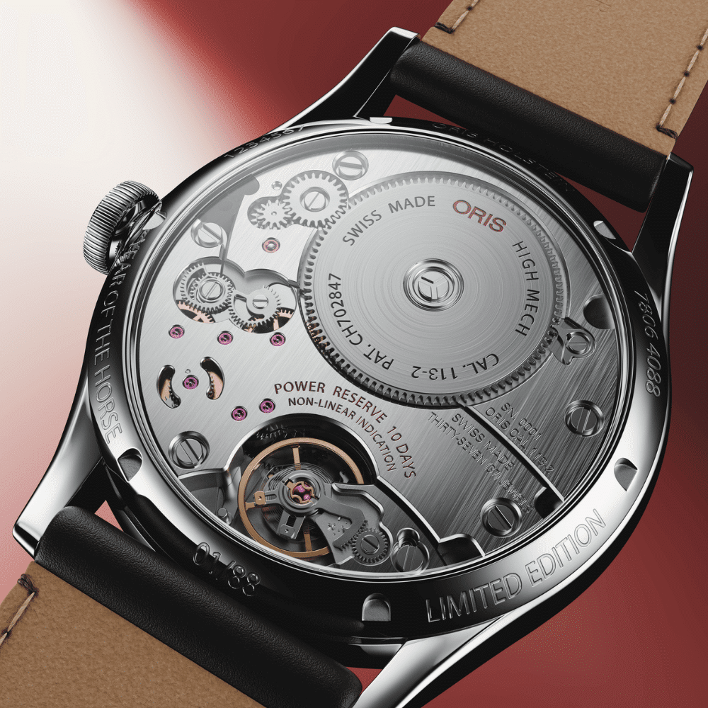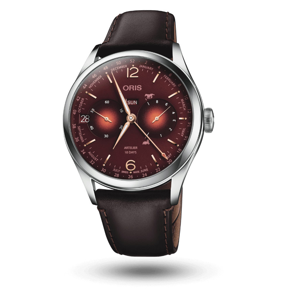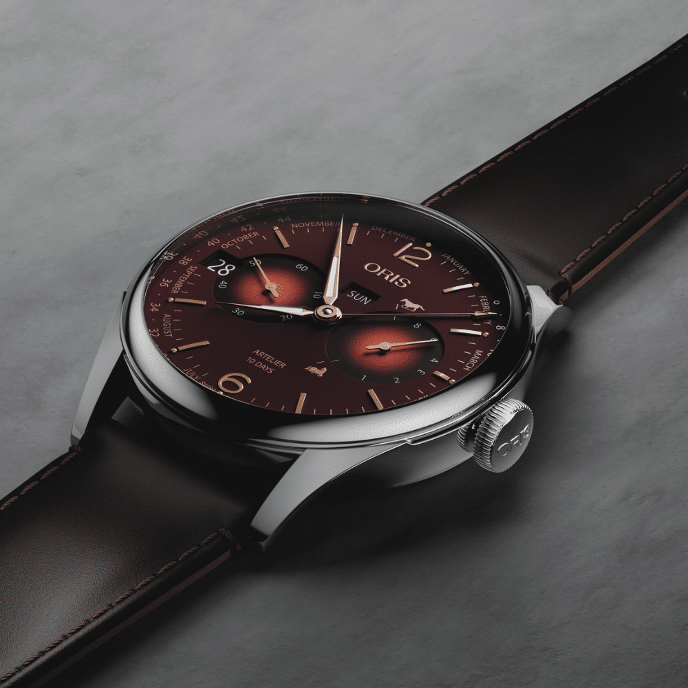 Animée par le prestigieux calibre manufacture Oris 113 à remontage manuel, cette montre suisse offre une réserve de marche impressionnante de 10 jours, un calendrier complet avec semaine, date, jour et mois, ainsi qu’un indicateur de réserve de marche non linéaire orné de motifs équestres symboliques. Son cadran rouge profond, son boîtier en acier de 43 mm et son bracelet en cuir cordovan brun en font une montre de collection, alliant haute horlogerie suisse, design raffiné et forte valeur culturelle. Un garde-temps rare et recherché par les collectionneurs Oris et amateurs de montres mécaniques exclusives.